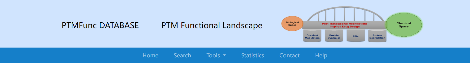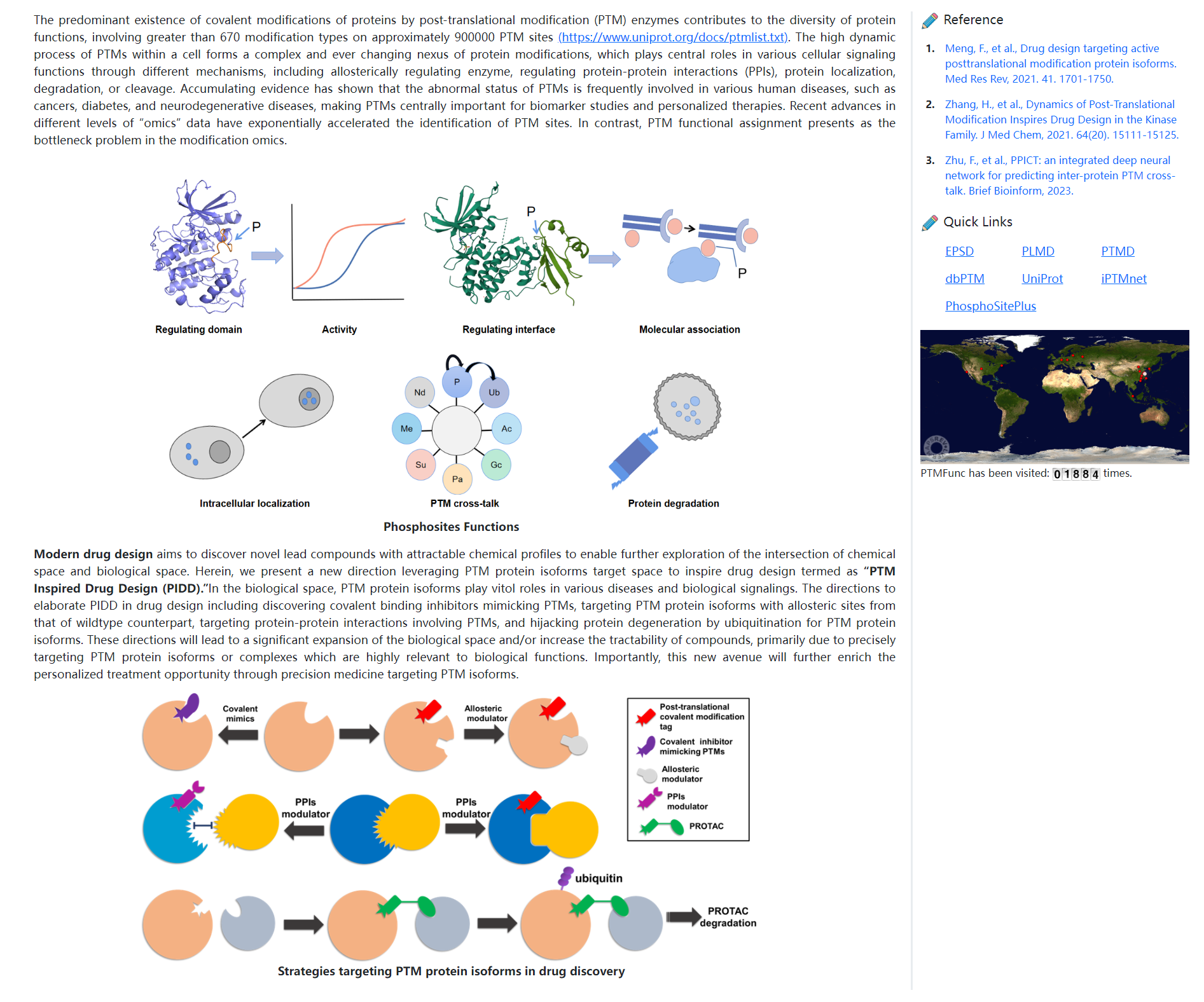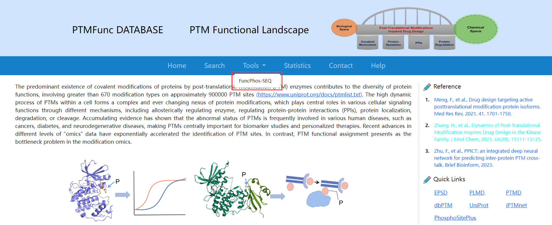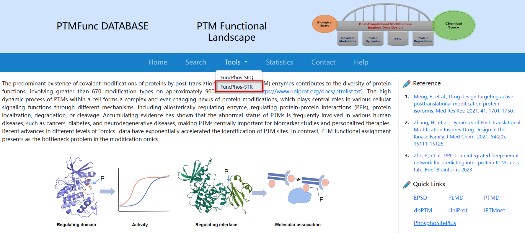 Main Frame: The main frame organizes pages containing the PTMFunc DATABASE entry list, reference, quick links and visit browse, in the multiple tab panels form. There are two types of functional phosphosite prediction, sequence-based and structure-based, which can be selected in Tools, and users can click DownLoad to view site statistics and download relevant protein sequences In PTMFunc DATABASE, related literature, phosphosite information and protein databases can be quickly accessed through links.