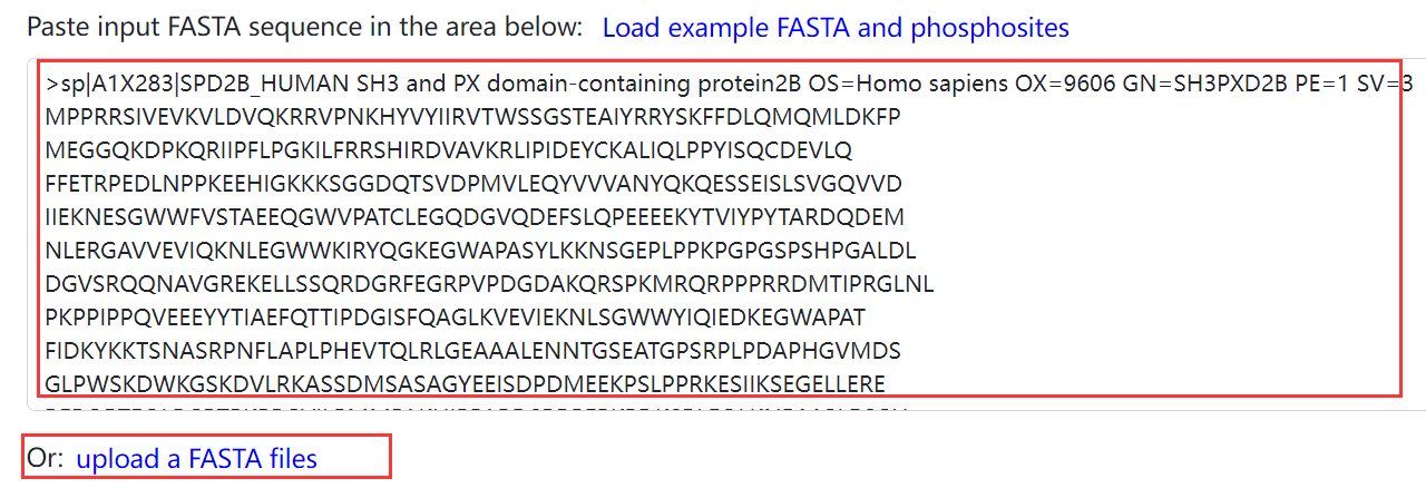 Two input methods are provided: text box input or loading a sequence fasta file (please use the standard format).