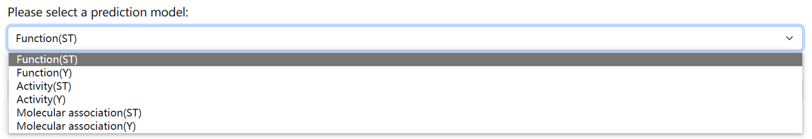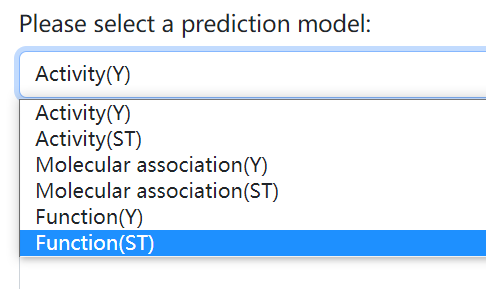 The website can be used for phosphosite general function as well as specific function prediction (e.g. Activity and Molecular association), distinguishing between residue types. Users can click on the drop down box to select as required. If activity (ST) is selected, it is used to predict the probability that a phosphosite with residue type S or T in the protein sequence would have activity function.