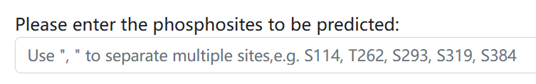 Based on the protein information, the user needs to manually enter one or more phosphosites that they want to predict. The format of the input phosphosites should include residue type and sequence number, such as S114, T262, S293, S391, S384 in the example. Be careful only S/T or Y residue type is permitted depending on the selected prediction models.