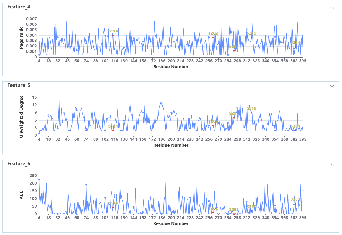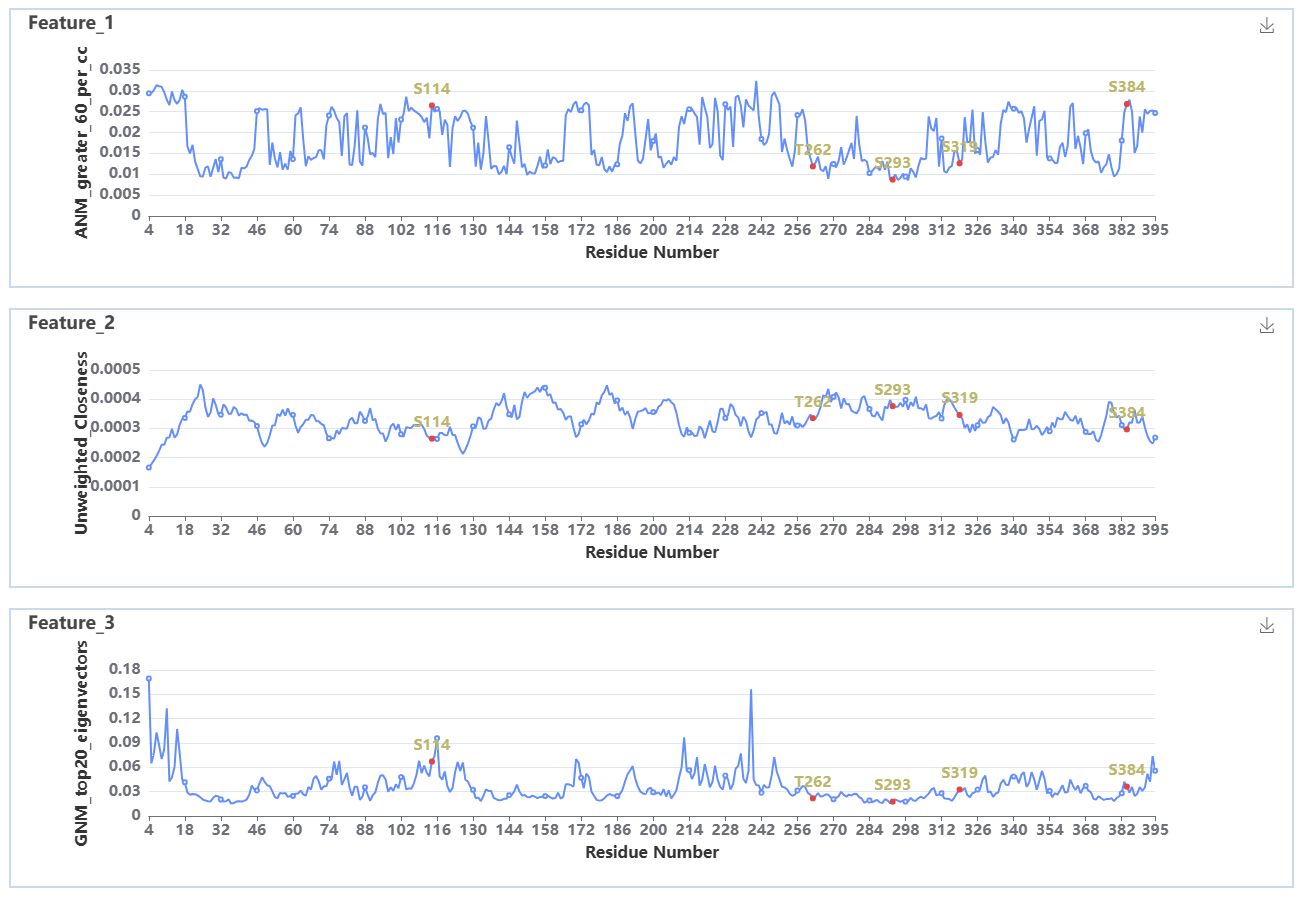 The line chart of the structural and dynamics features for residues in protein structure, with input phosphosites labeled as red dot and with residue type and number information.