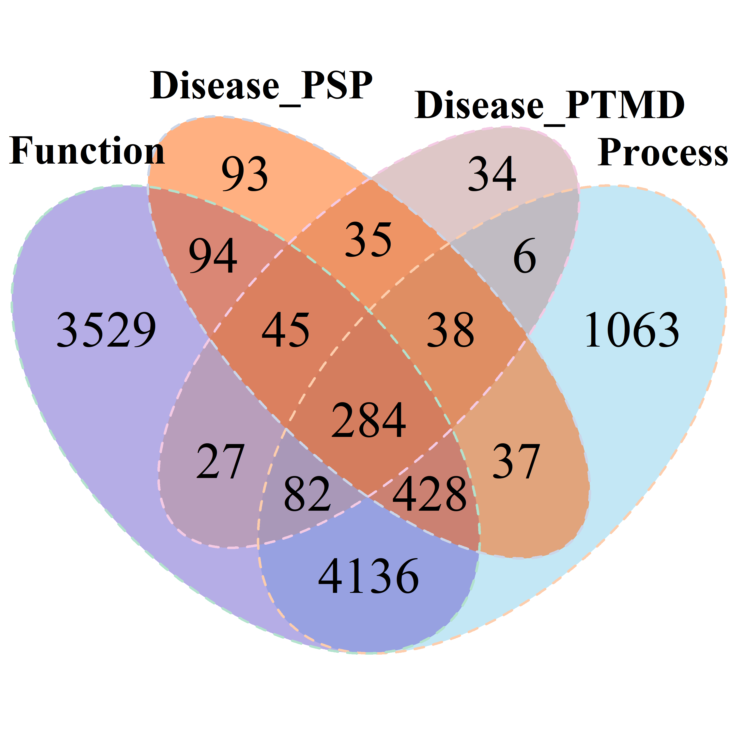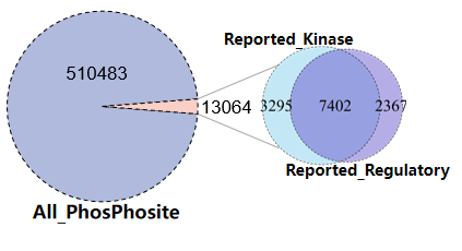 The functional phosphosite data used in this work were obtained from the PhosphoSitePlus (PSP, 2022.7database). Regulatory_sites dataset from PSP contains 18518 PTM loci with reported regulatory functions, including detailed information of molecular functions, biological processes, and intermolecular interactions of the site. Focusing on human protein phosphosites, 9769 regulatory phosphosite (135063 phosphosites in all) in 3335 human proteins were finally collected. In addition, the complementary information of the phophosites, e.g., kinases, and diseases, was supplemented. The numbers of phosphosites and phosphoproteins collected are shown in the table and figures.