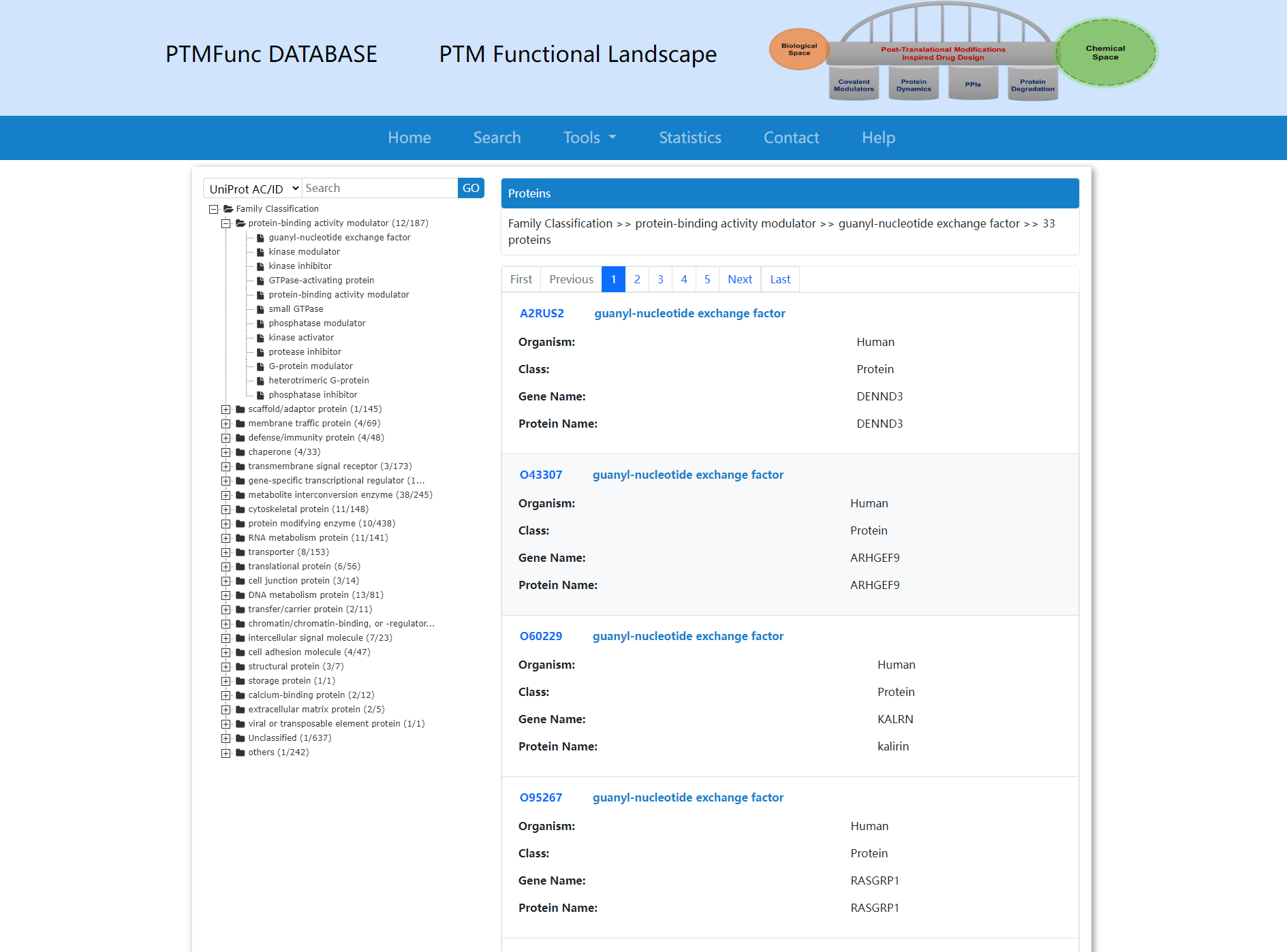 In the search page, proteins are categorized according to family information, and by clicking on specific categories, you can browse information about the proteins belonging to them, such as protein origin, gene name, etc. (Note: The numbers are used to indicate the subclasses of the protein family and the number of proteins, e.g. (12/187): 12 is the number of subclasses of the protein-binding activity modulator family, 187 means that a total of 187 proteins belonging to this family have been collected.)