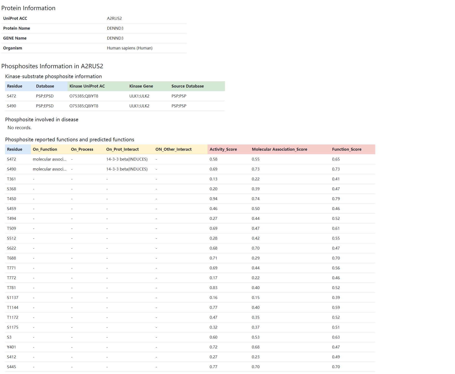 Click on the protein name on the Upper left corner to be redirected to this protein detail page, which lists the protein, phosphosite and site kinase, functional score and other information in detail.