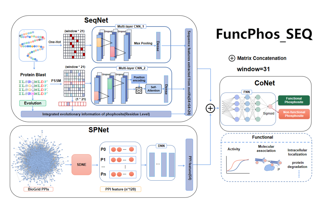 FuncPhos-SEQ requires only the raw protein sequence and concerned phosphosites as input, avoiding the problem of losing information for a large amount of phosphosites due to the limited number of protein crystal structures. It is computationally efficient and has a broader scope of application for biologists.